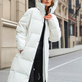 Entwickelt für die moderne Frau, bietet diese lange Daunenjacke ein schickes, einfarbiges Design und ist ideal, um sie mit unterschiedlichen Outfits zu kombinieren, sei es lässig oder elegant. Die zusätzliche Kapuze sorgt für zusätzlichen Schutz und macht sie perfekt für funktionale und stilvolle Unternehmungen bei kühlem Wetter.