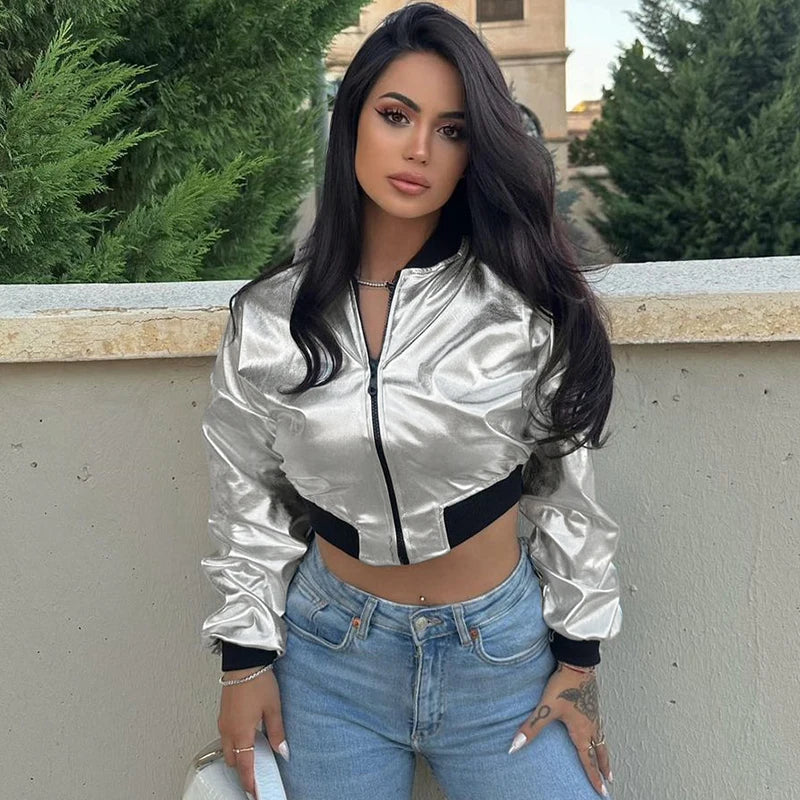Diese metallische, verkürzte Bomberjacke ist ein markantes Mode-Highlight für Streetwear mit elegantem Akzent.