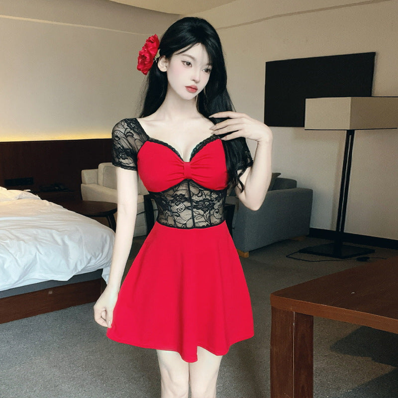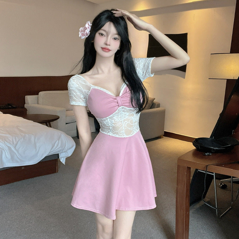 Stil: Privater Promi-Stil, Einzelstück. Rocklänge: Kurz. Ausschnitt: V-Ausschnitt. Trendige Elemente: Spitze. Design: Basisstil. Verschluss: Pullover. Ärmel: Kurz. Kategorie: Kleid. Stil: Sexy. Verarbeitung: Patchwork/Splicing.