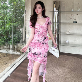 Langes Blumenkleid mit charmantem Rüschen-Saum und unregelmäßigem Schnitt