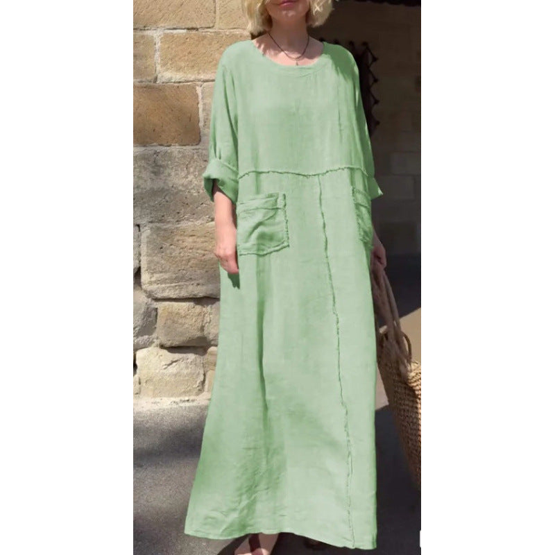 Polyester Kleid, Einteiler, langer Rock, runder Ausschnitt, lange Ärmel, regulärer Schnitt, kein Knopfverschluss, lässiger Stil, gekräuselt.