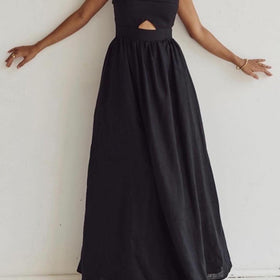 Dieses schwarze Maxi-Kleid strahlt mühelose Eleganz und Raffinesse aus. Das Kleid hat ein tailliertes Oberteil mit dünnen Spaghettiträgern und einem subtilen Ausschnitt unter der Brust, das einen modernen Touch verleiht, ohne von seinem zeitlosen Reiz abzulenken. Der Rock fällt sanft und fließend und sorgt für einen anmutigen und luxuriösen Look.