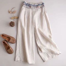 LIZA - Vintage-Hose aus lockerer Baumwolle verbindet Mode mit Komfort. Die einzigartige Stickerei verleiht Ihrer Garderobe ein exklusives Flair. Der leichte Leinenstoff sorgt für angenehmen Tragekomfort auch an warmen Tagen. Perfekt für Spaziergänge oder einen Brunch – stilvoll und bequem.