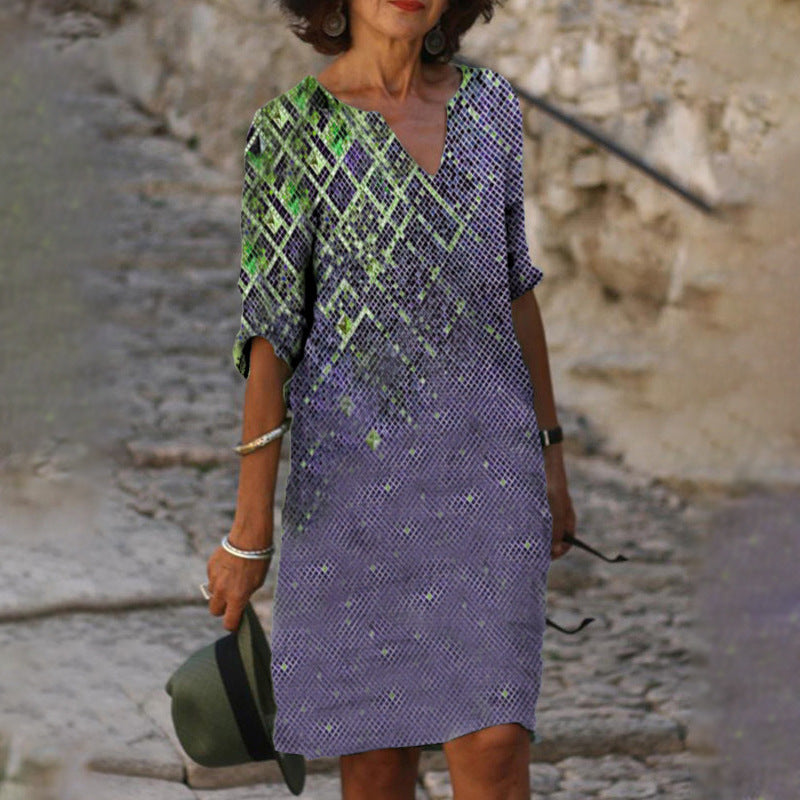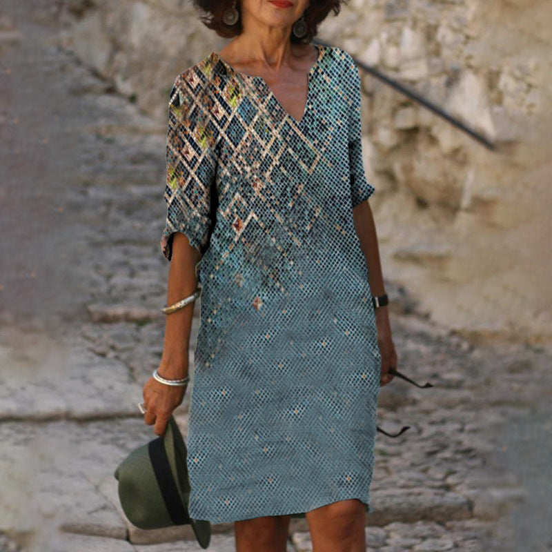 Leichtes, lässiges bedrucktes Kurzkleid mit V-Ausschnitt von Fudus