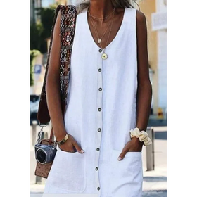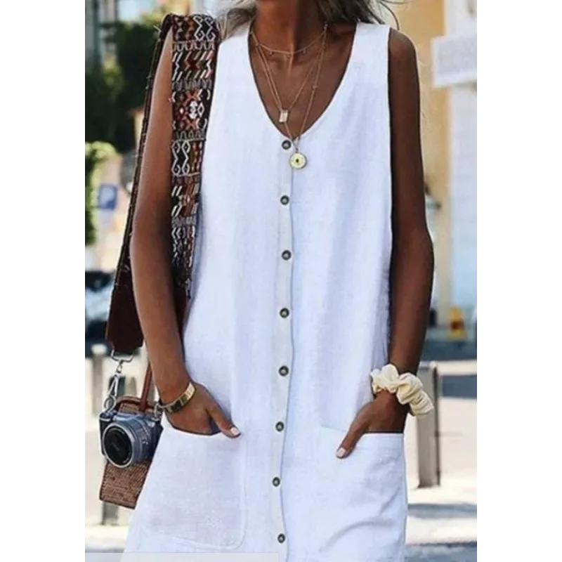 Dieses Kleid aus hochwertigem, luftigem Leinen überzeugt durch eine schmeichelhafte, lässige Silhouette mit elegantem Seitenschlitz. Der ärmellose Schnitt und der tiefe Ausschnitt machen es vielseitig einsetzbar. Perfekt für Tag und Abend. Minimalismus trifft Charme.