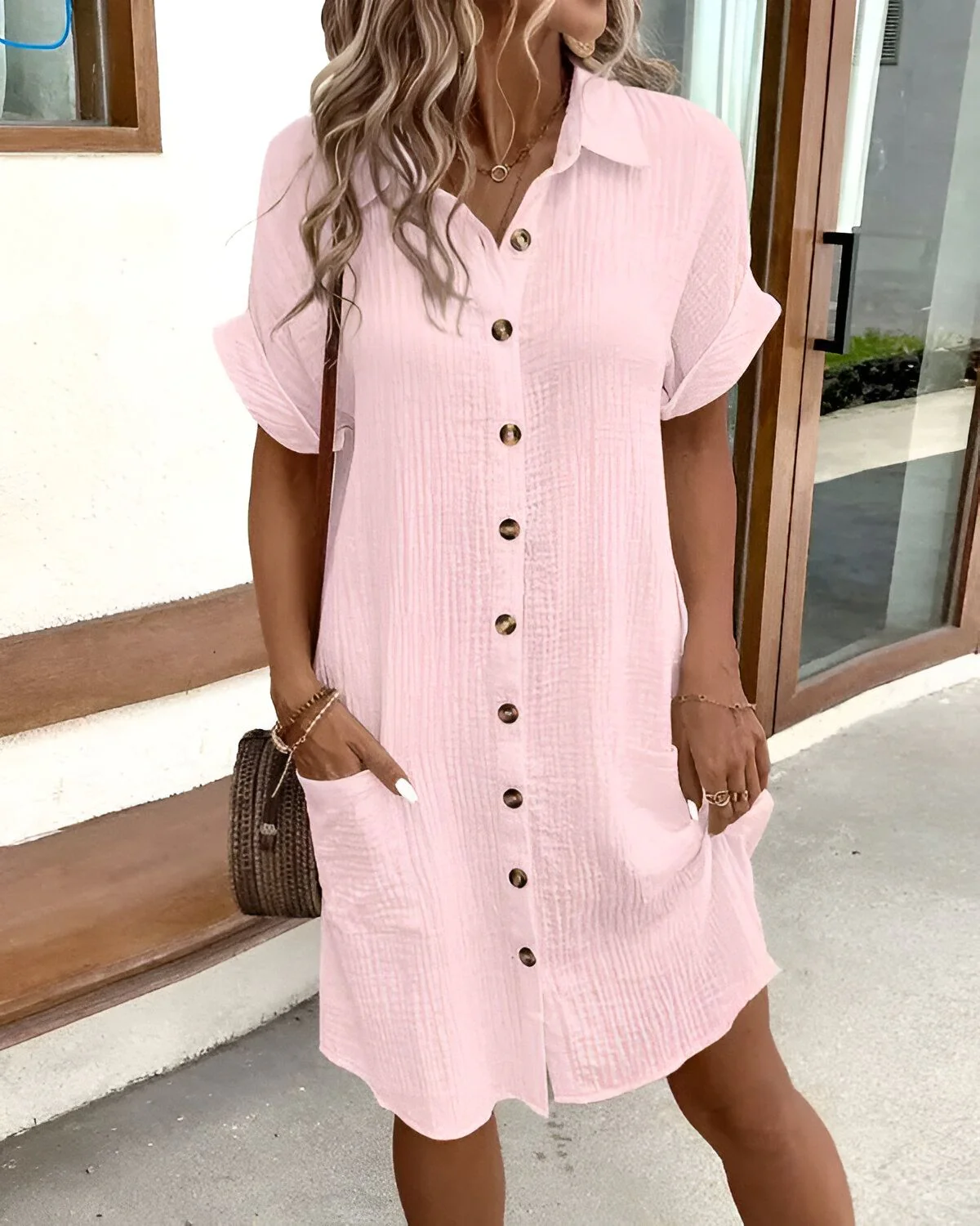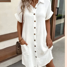 Dieses Mini-Hemdkleid kombiniert schmeichelhaften Schnitt mit luftigem Tragekomfort, perfekt für warme Frühling- und Sommertage. Das leichte Material fühlt sich angenehm an und sorgt für mühelose Eleganz. Stilvolle Silhouette – die richtige Mischung aus Lässigkeit und Chic. Ob Stadtbummel, Strand oder entspanntes Treffen – dieses Kleid sorgt für einen selbstbewussten, femininen Look.