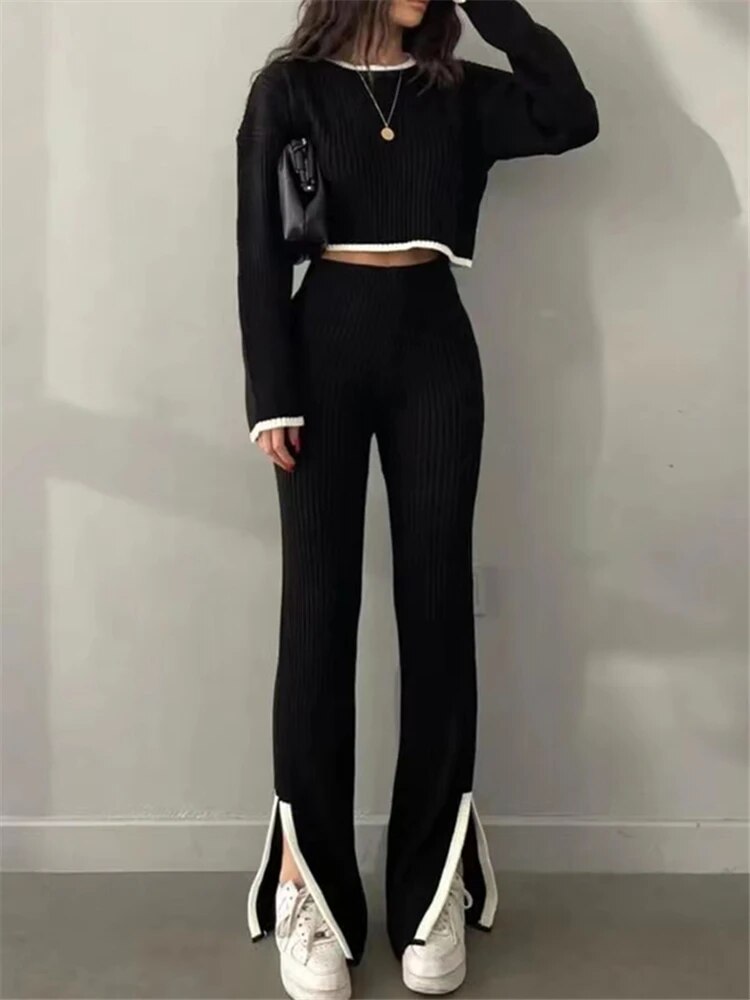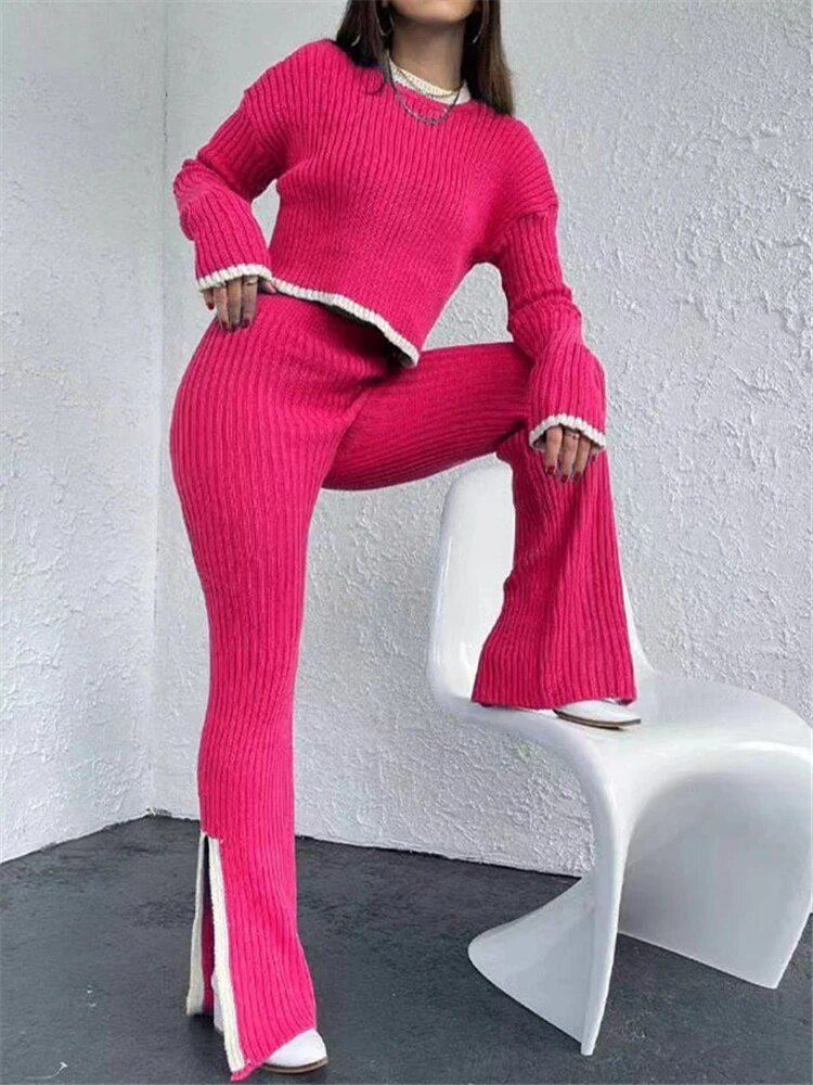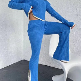 Dieses einzigartige Set besteht aus einem langärmeligen Oberteil und einer Hose mit weitem Bein und unterem Schlitz. Es wurde für all diejenigen entworfen, die Mode und Komfort in ihrer täglichen Kleidung schätzen.