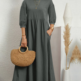 Dieses locker geschnittene Midikleid mit Rundhalsausschnitt, 3/4-langen Laternenärmeln und geraffter Taille ist aus leichtem, unifarbenem Stoff gefertigt. Ideal für Frühling, Sommer und Herbst.