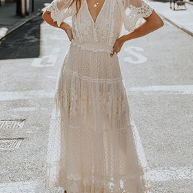 Das Midikleid Hikari ist ein elegantes Meisterwerk mit verführerischem V-Ausschnitt und raffinierten Spitzendetails. Kurze Ärmel und Midi-Länge machen es zum perfekten, komfortablen Sommeroutfit.