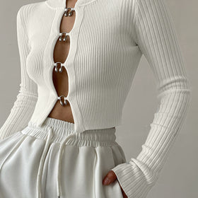 Rippstrick Oberteil mit V-Ausschnitt, Perlendetail und Splitt