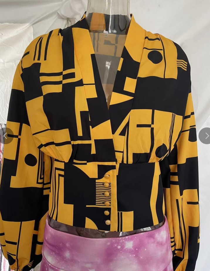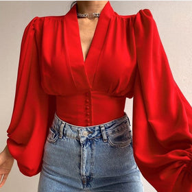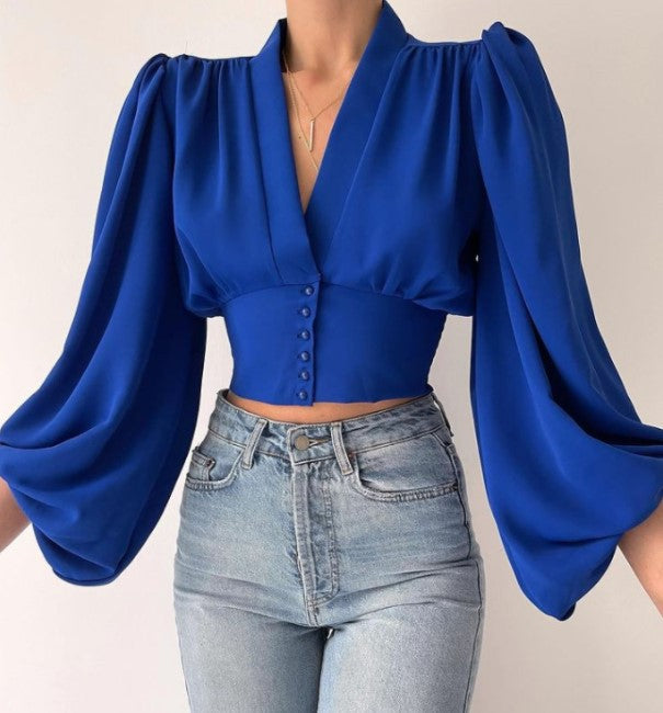 Romantische Bluse mit V-Ausschnitt und Laternenärmeln von Fudus