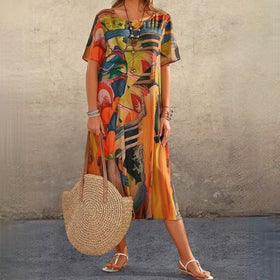 Das stylische Sarah Sommerkleid mit geometrischem Muster ist perfekt für warme Sommerabende. Das moderne Muster macht es zum Hingucker. Leicht und luftig, ideal für heiße Tage. Vielseitig kombinierbar mit Sandalen oder Sneakers.
