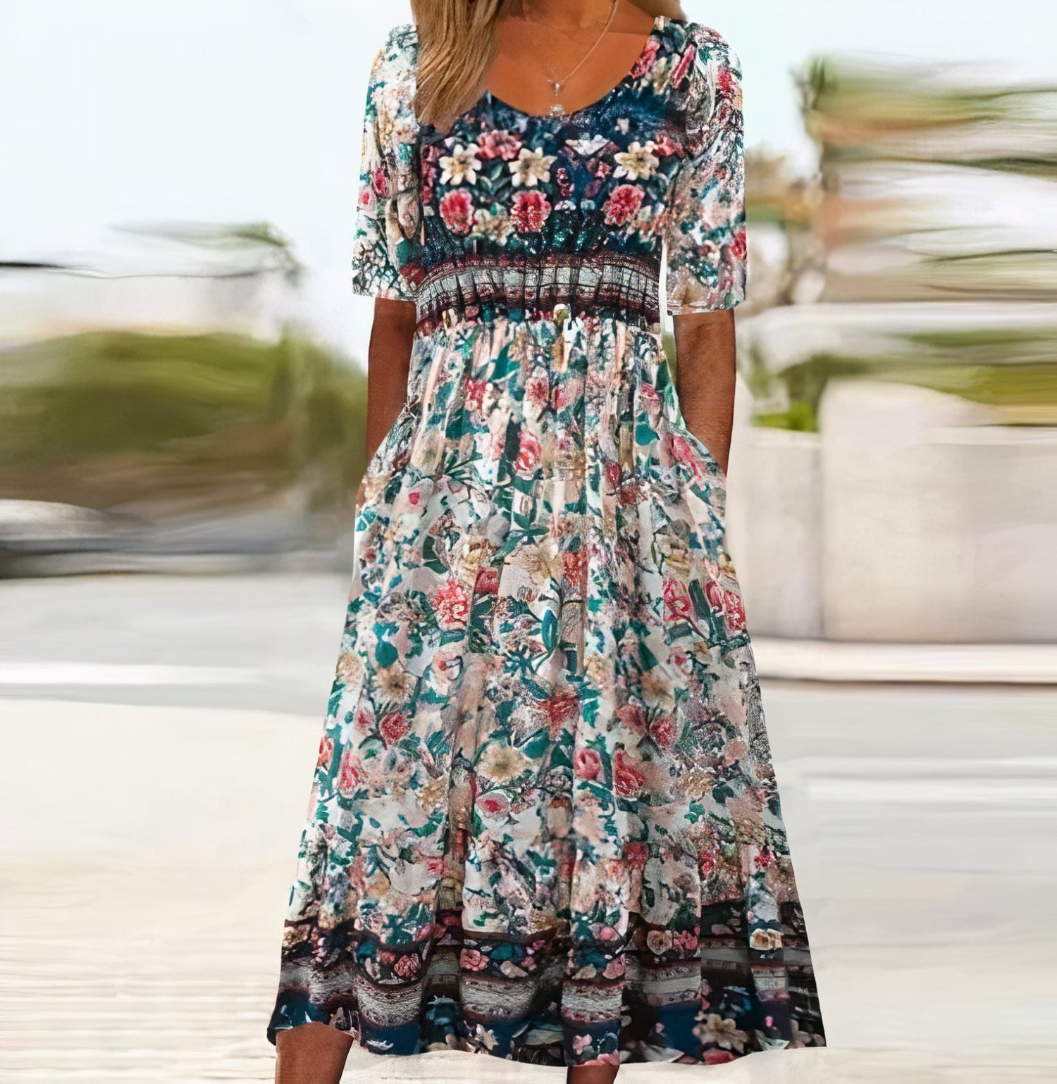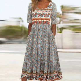 Dieses elegante, böhmische Kleid verbindet romantische Leichtigkeit und stilvolle Raffinesse. Der fließende Schnitt und das luftige Material sorgen für angenehmen Tragekomfort an warmen Tagen. Ideal für Spaziergänge, Gartenpartys oder Abendessen – es vereint Boho-Charme mit Eleganz. Tragen Sie es mit Sandalen oder Absatzschuhen.
