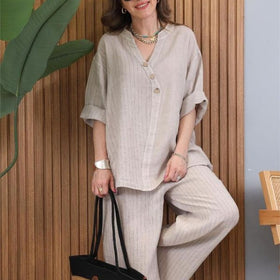 Das Sheri Loungewear Set, bestehend aus luftiger Bluse mit asymmetrischem Kragen und weiter Hose, bringt mühelose Eleganz in Ihre Garderobe. Ideal für legere Tage und stilvolle Ausflüge.