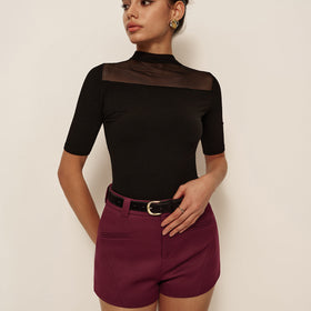 Schlichtes Oberteil mit transparentem Mesh-Einsatz oben. Körpernah, leichter Stoff, angenehmes Tragegefühl. Runder Ausschnitt, halblänge Ärmel. Dezente Struktur, vielseitig kombinierbar.