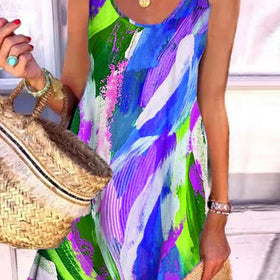 Genießen Sie die Leichtigkeit und den verspielten Charme dieses ärmellosen Kleides mit lebhaftem Farbblockdruck!