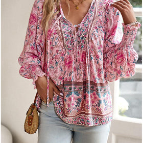 Dieses luftige Boho-Blumenhemd mit stilvoller Schnürung vereint Eleganz und Lässigkeit für deinen Sommerlook. Das leichte, atmungsaktive Material sorgt für angenehmen Tragekomfort, das florale Design für Romantik. Ideal für warme Tage, entspannte Ausflüge oder Sommerabende.