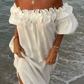 Sophie: Rüschen-Midikleid mit Puffärmeln, Carmen-Ausschnitt und Taschen