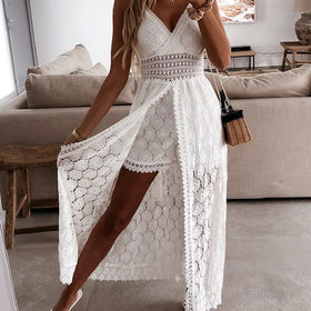 Dieser tolle Boho-Playsuit aus Spitze mit eingearbeitetem Blumenmuster hat hinten eine lange Schleppe – fast wie ein langes Kleid! Er hat süße Spaghettiträger aus Spitze. Perfekt für Strandtage oder warme Sommertage!