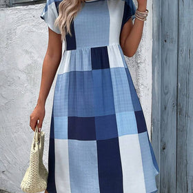 Stilvolles kariertes Kleid mit Fledermausärmeln und Farbblock-Design von Fudus