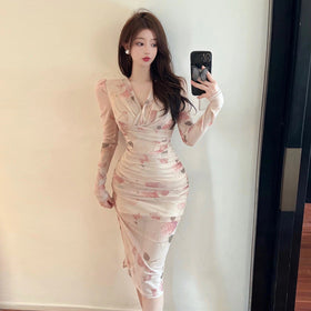 Trendiges Fudus Mesh-Kleid mit V-Ausschnitt, Raffung und Knoten