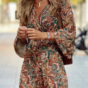 Stilvoll und bequem: Dieses lebhafte Paisley-Wickelkleid in fließender Silhouette besticht durch seine Erdtöne. Der leichte Stoff und das Boho-Design sind ideal für warme Tage.